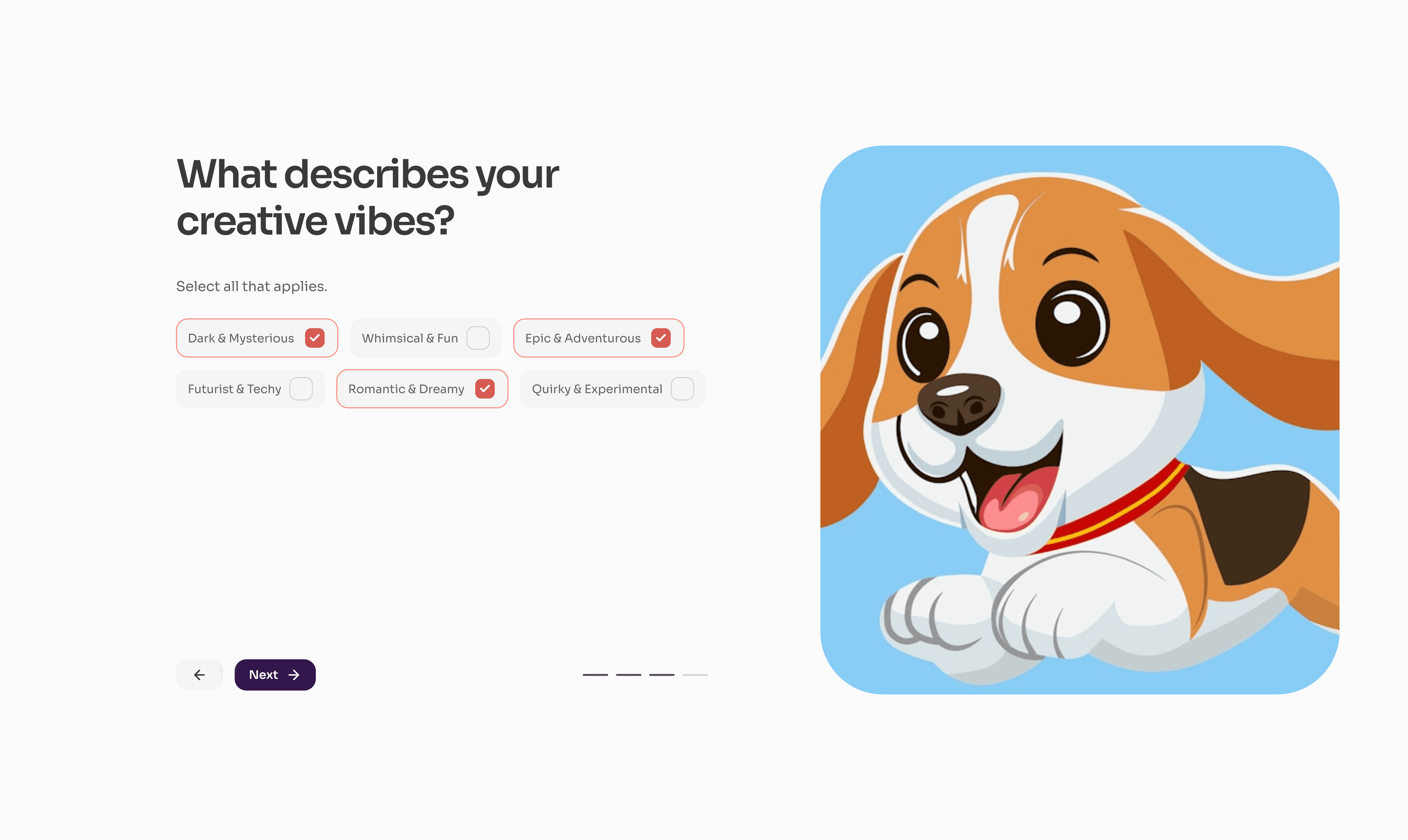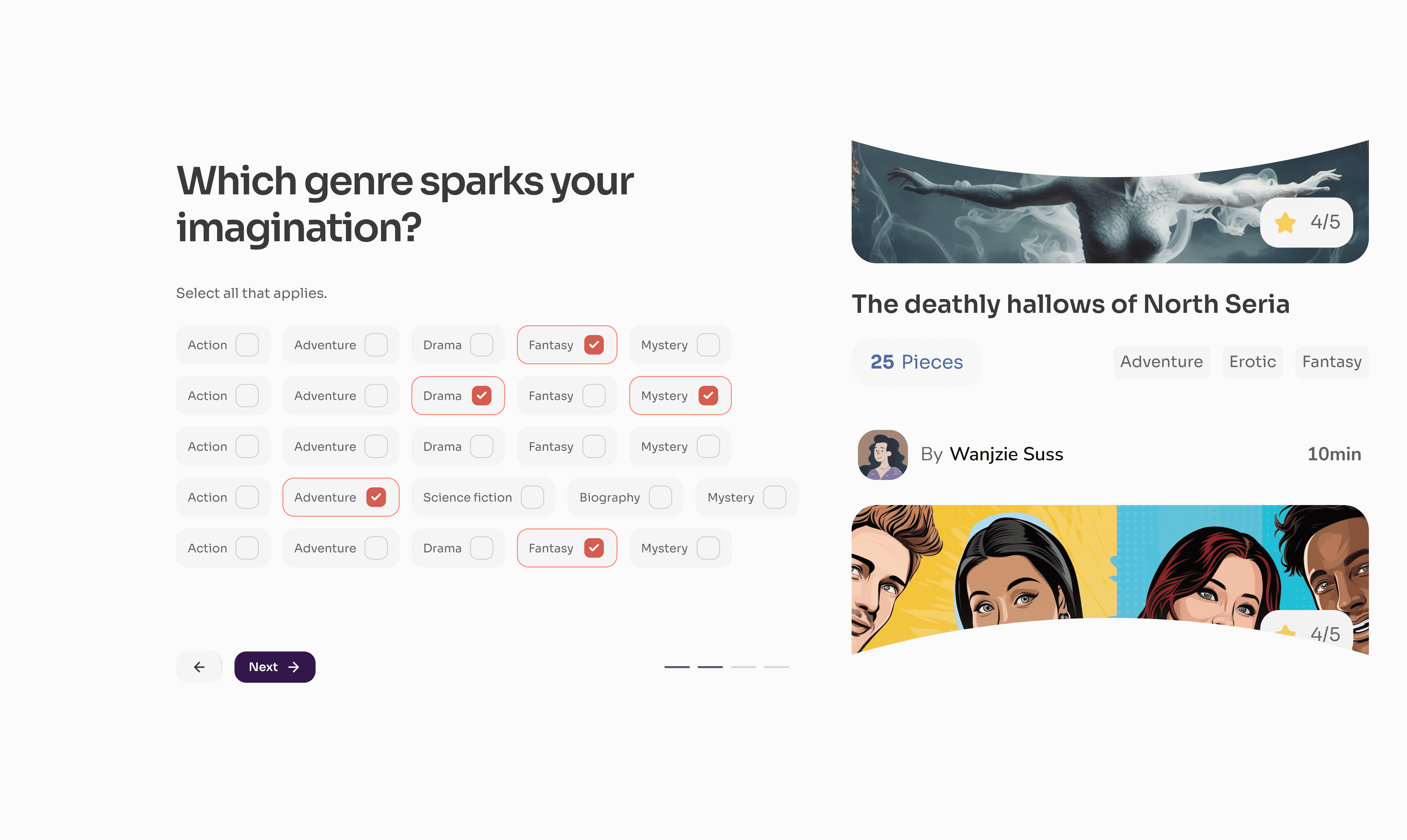 To get users in and improve setup time, we decided to introduce the profile setup earlier, followed by the genre selection, and creative vibes, this would help Fable suggest and tailor users experience to their choices.