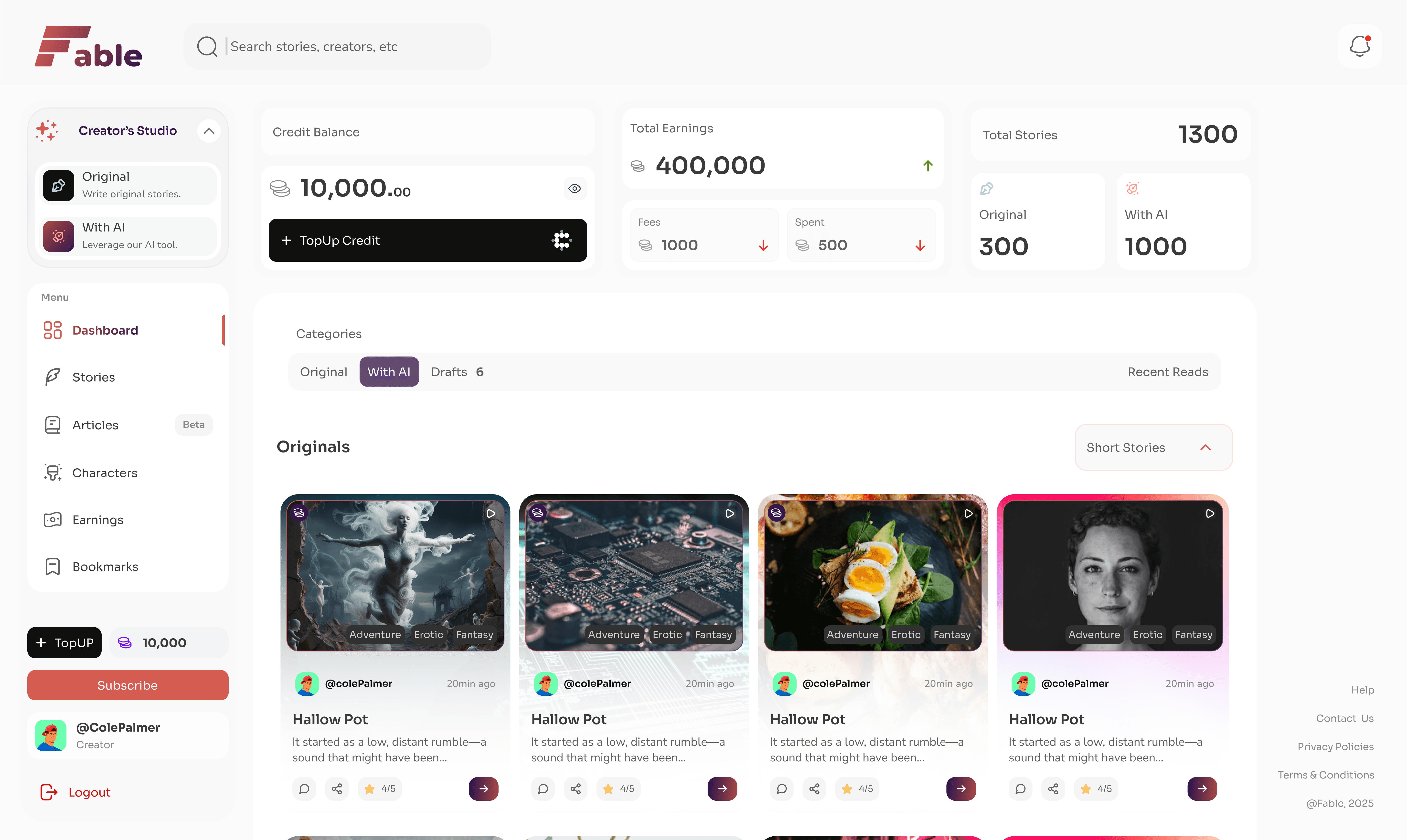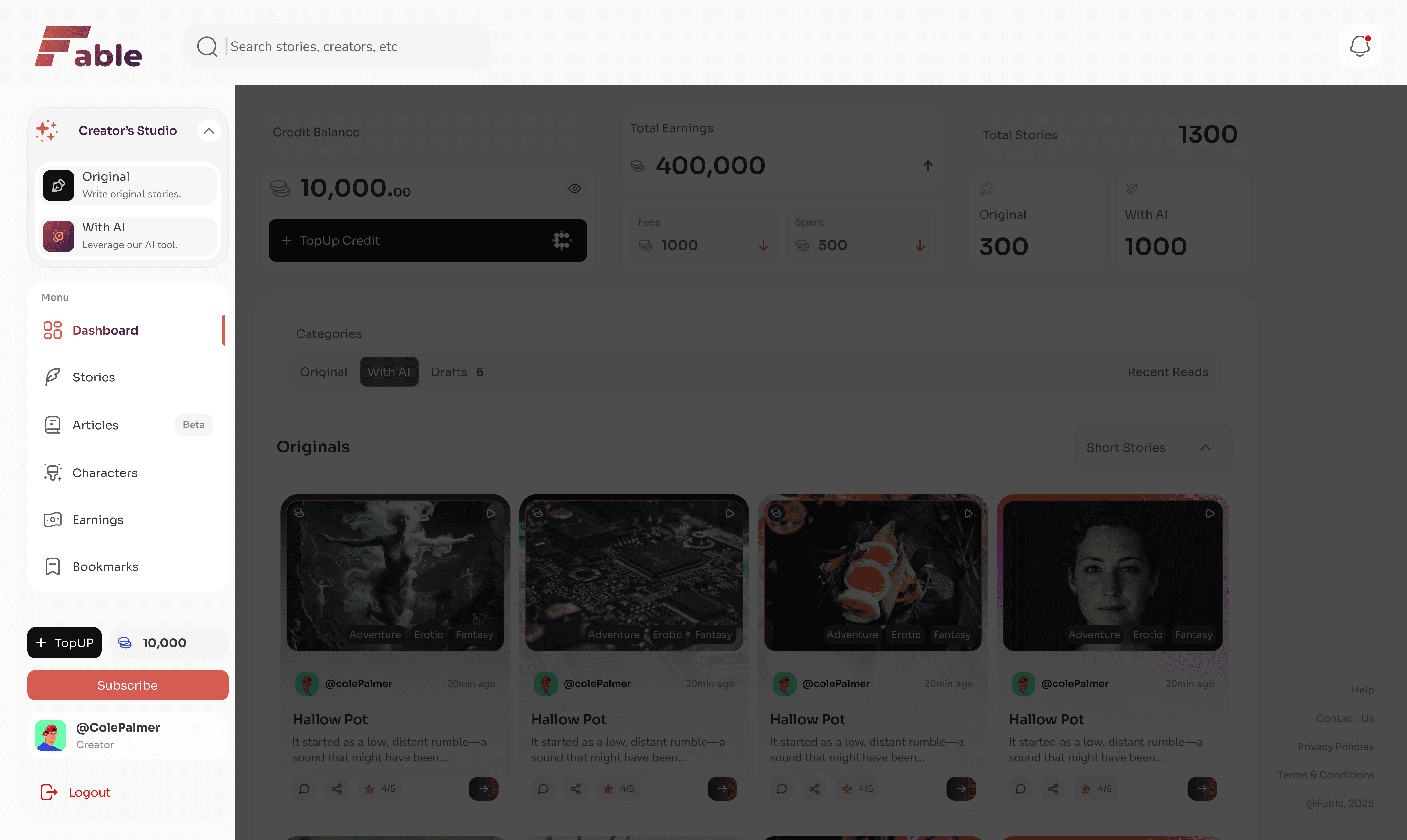 Previously, writers found it difficult to understand their earnings and story progress, often feeling uncertain about microtransaction payouts, credit balances, and reader engagement. Realizing Fable already had the right information scattered across different screens, I redesigned a more intuitive dashboard that clearly guides users from story stats to wallet overview, making the entire experience smoother and more transparent.
