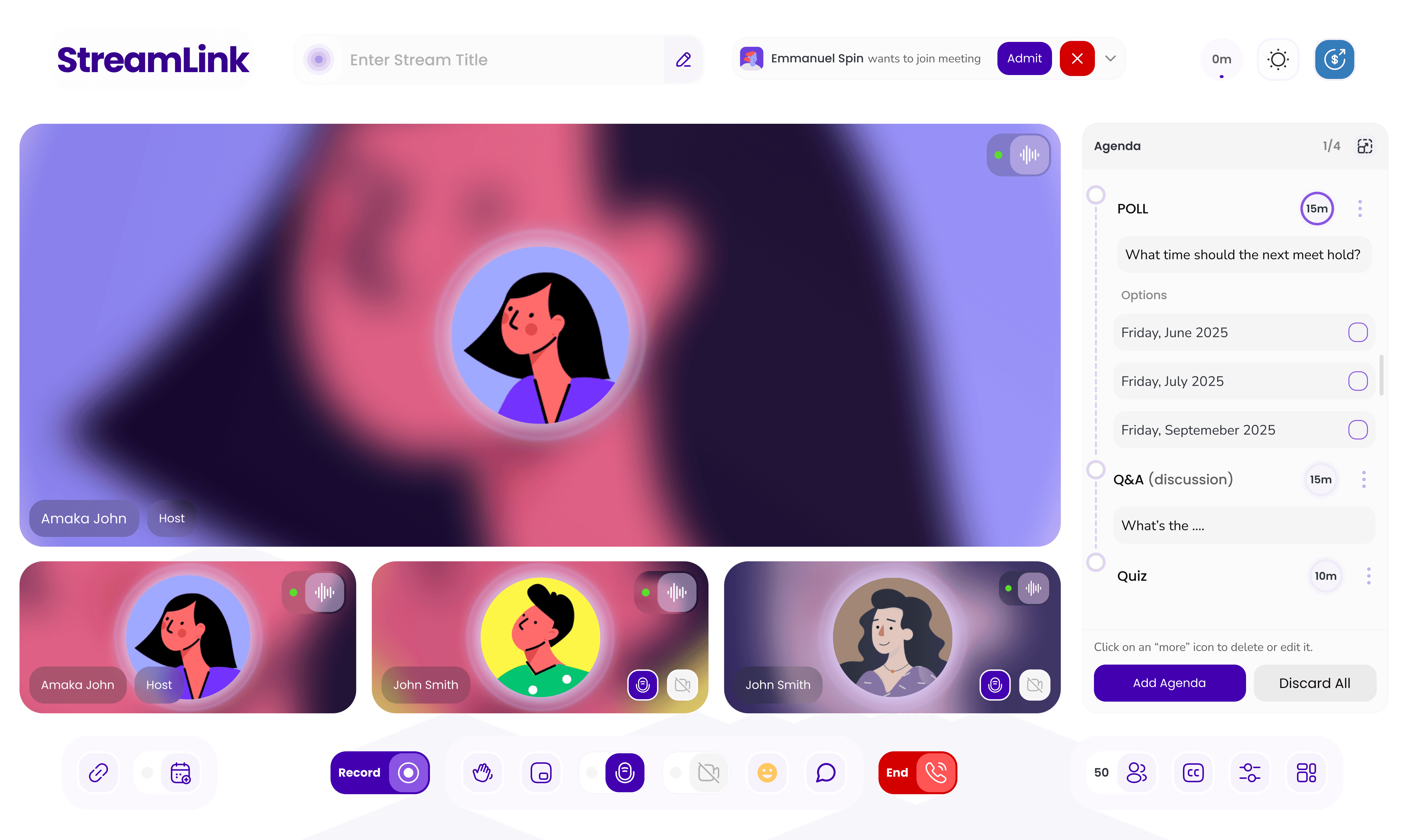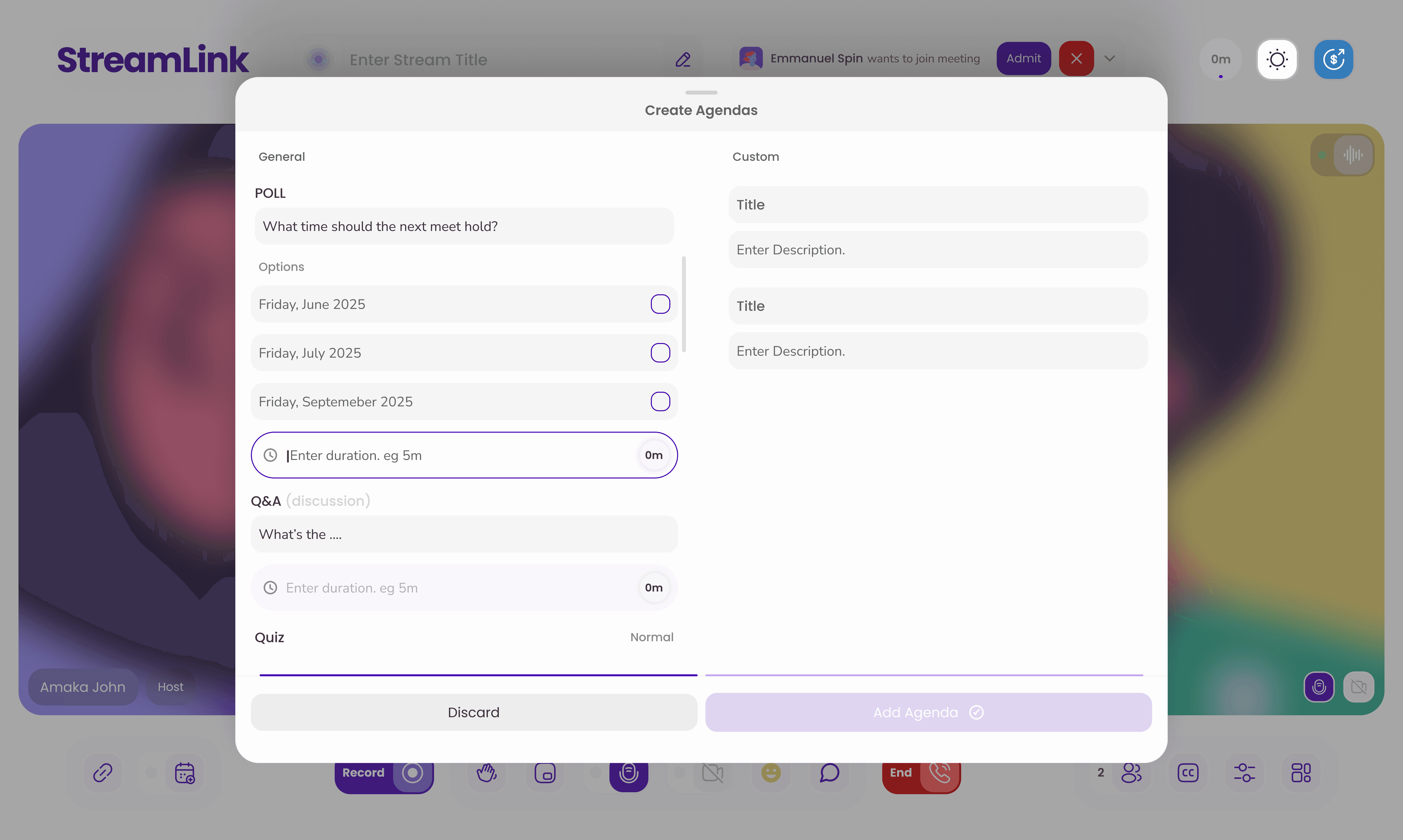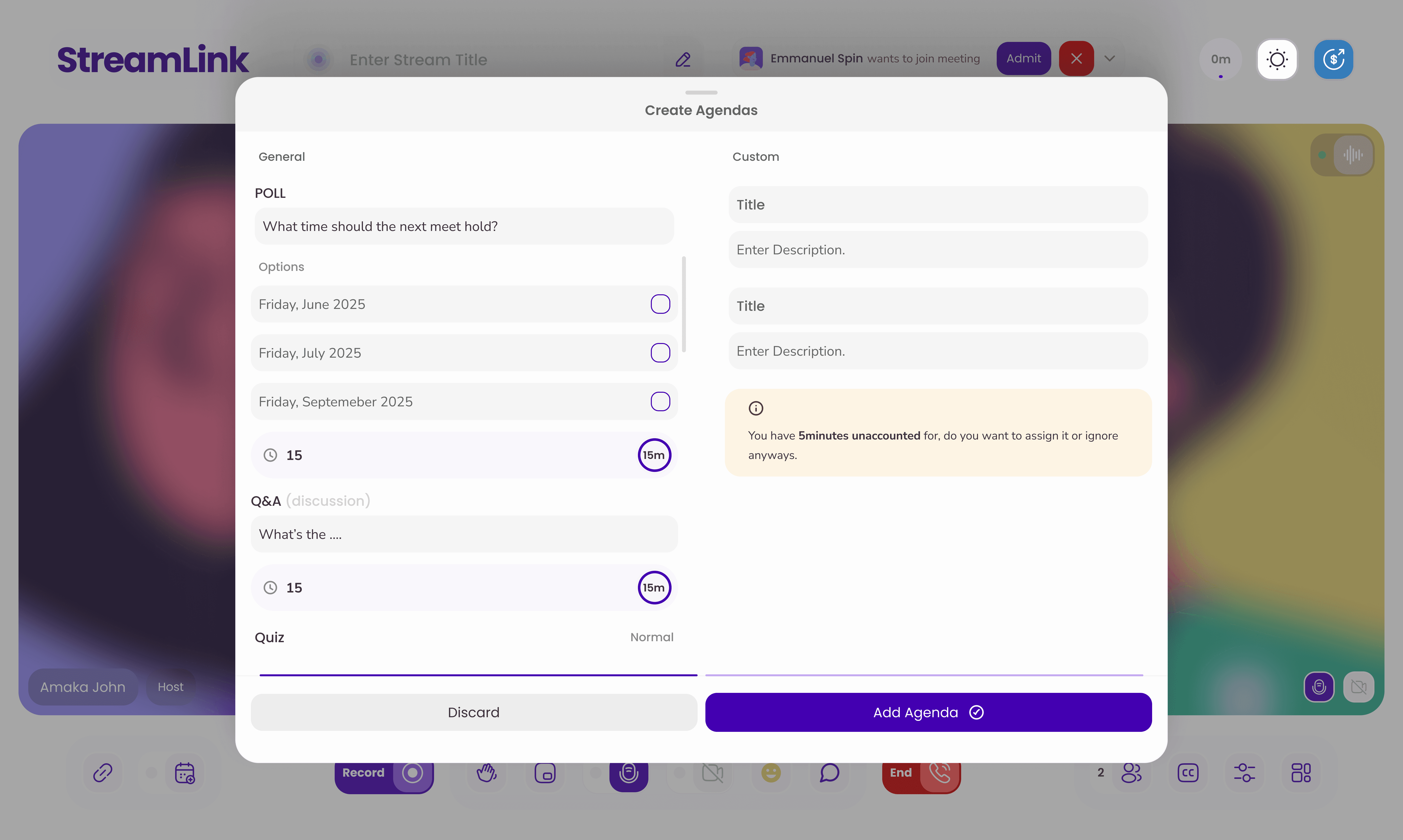 Agendas helps both host and attendees stay on track, utilize time and give real time update on meeting, by polls, Q&As, or even creating a custom agenda.