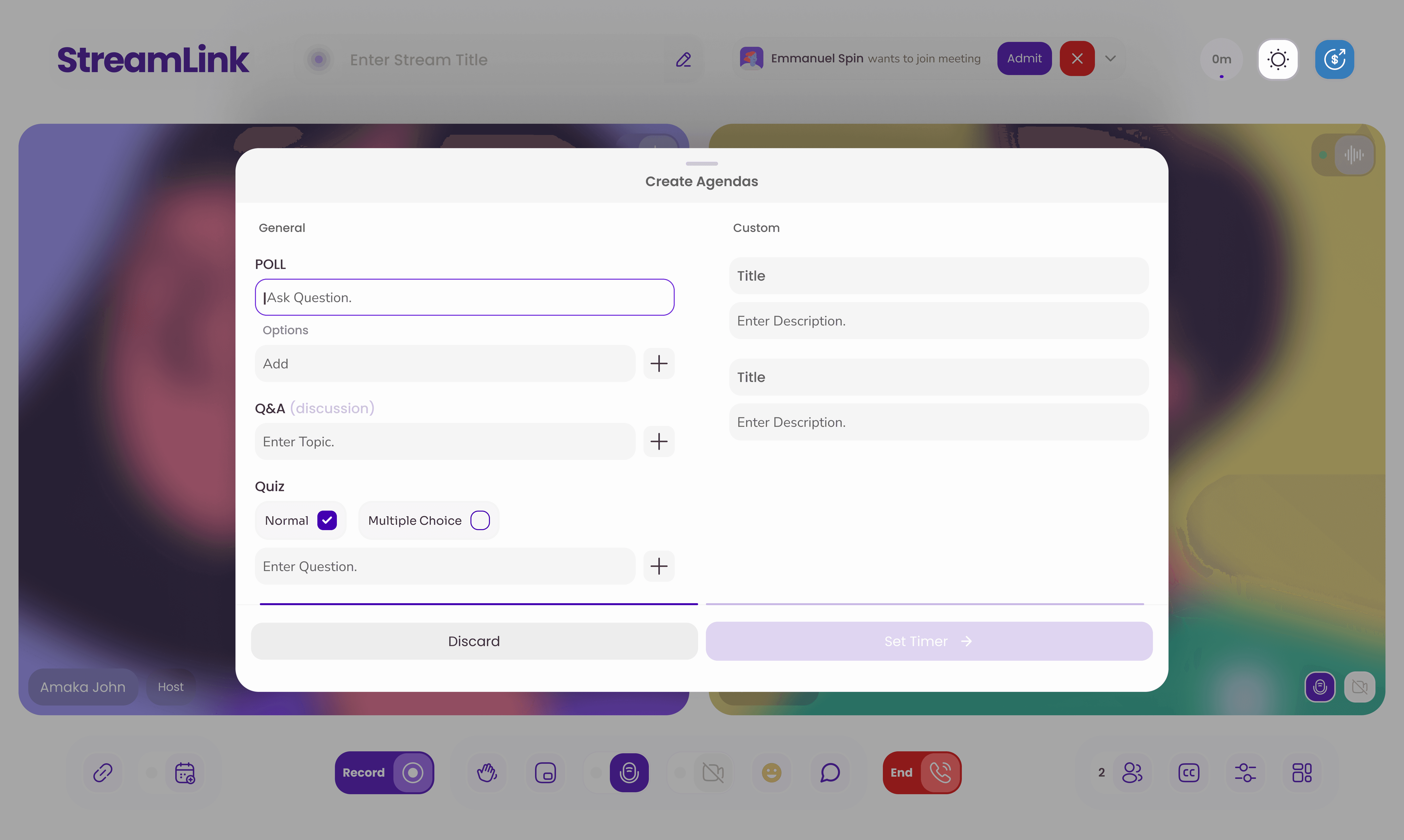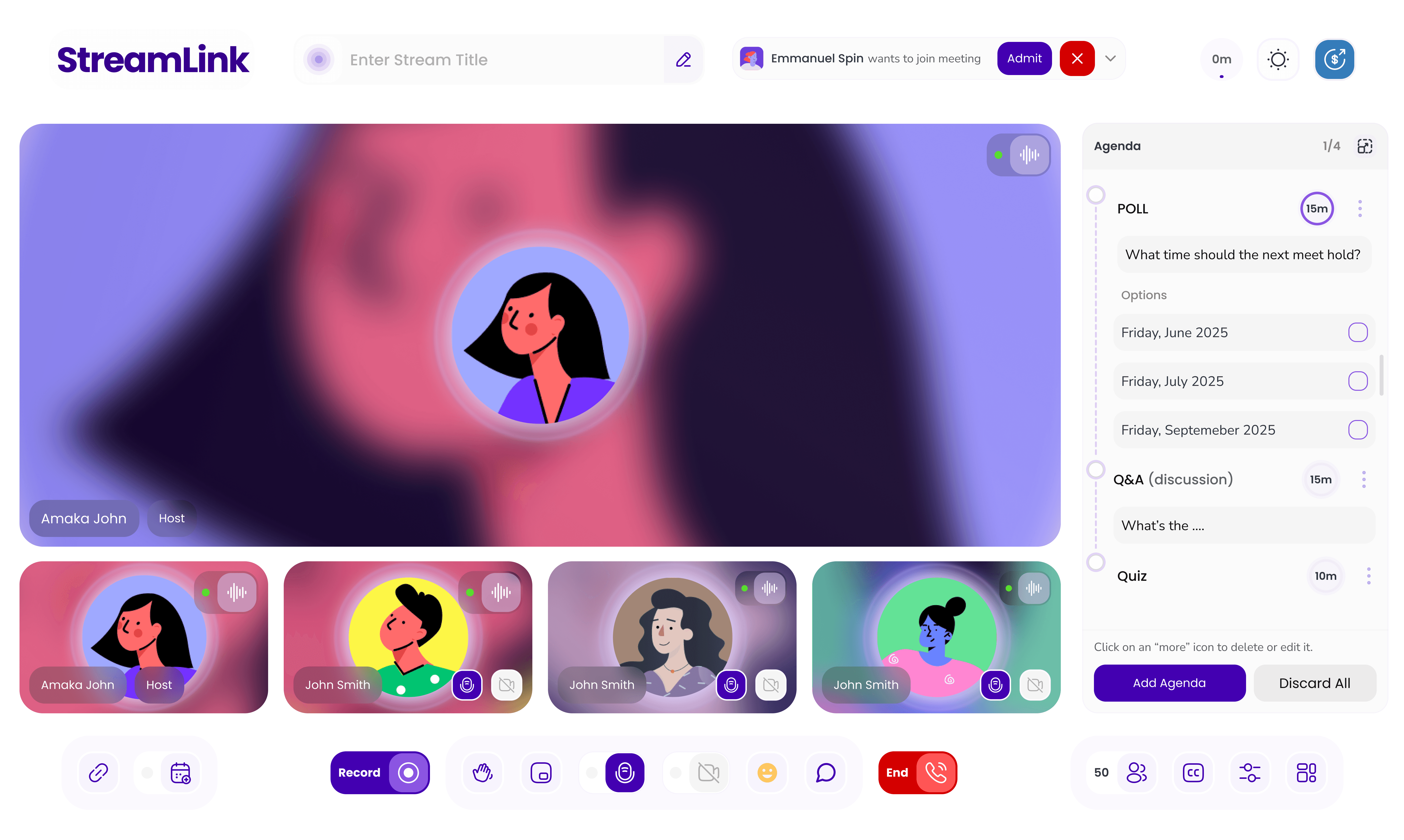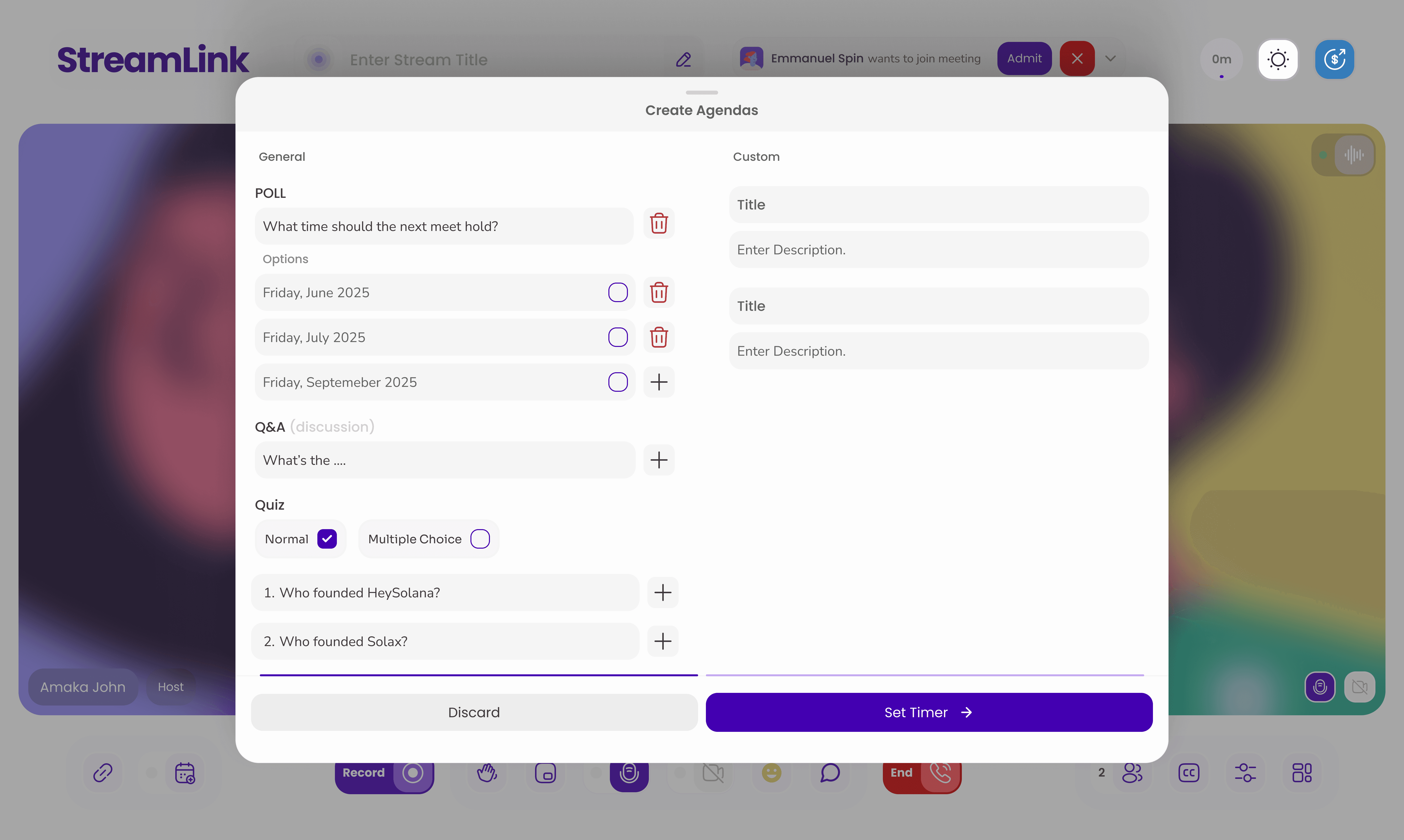 Agendas helps both host and attendees stay on track, utilize time and give real time update on meeting, by polls, Q&As, or even creating a custom agenda.
